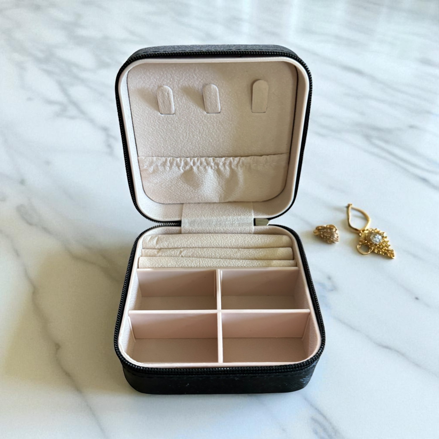 Travel-size jewelry box that’s small, compact, and protective—perfect for keeping your favorite pieces safe and tangle-free on the go.