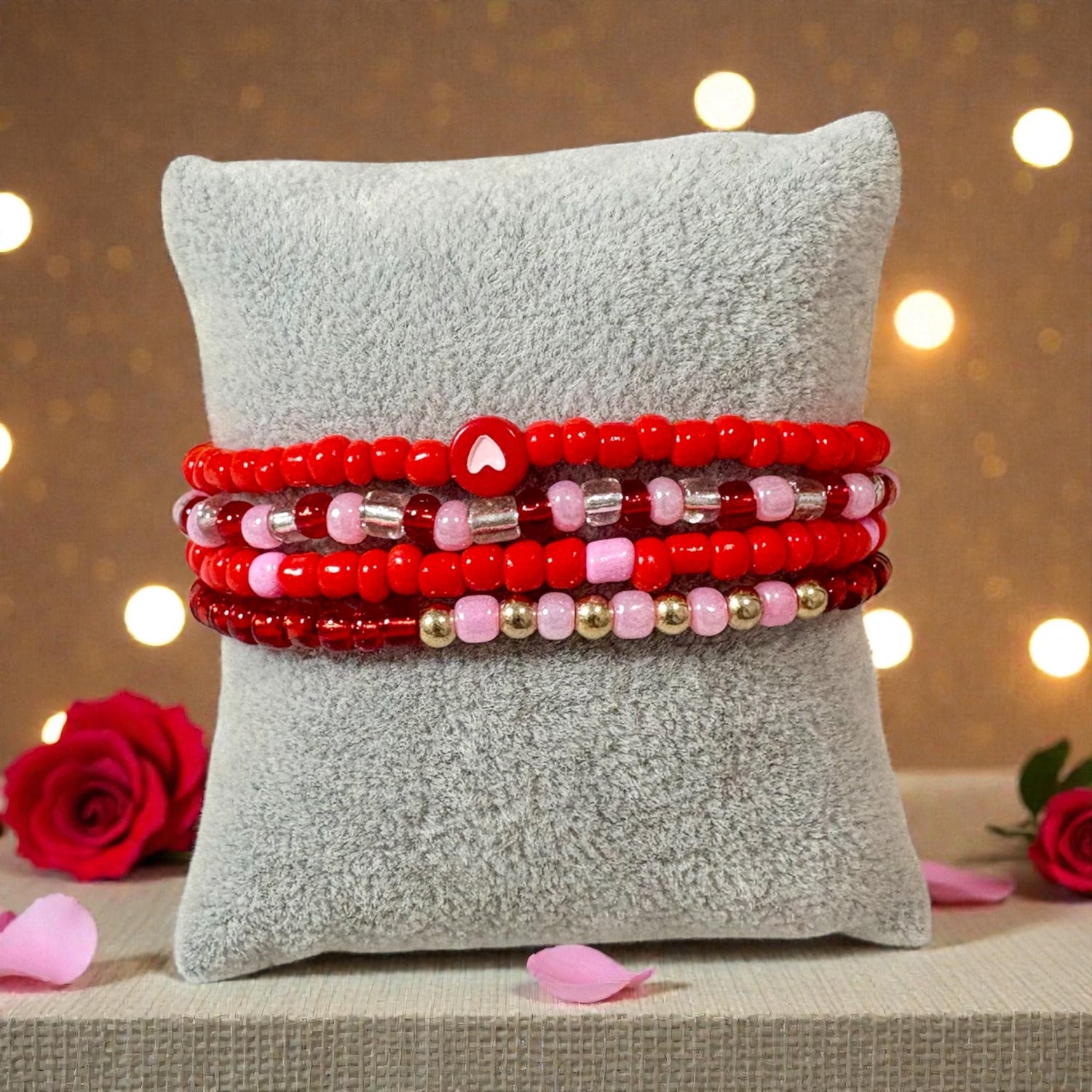 Celebrate Valentine’s Day with this set of four Valentine-themed seed bead bracelets! Each bracelet is lightweight, comfy, and easy to stack or wear solo for a simple pop of festive color. Perfect for anyone, these bracelets make a fun little gift, party favor, or sweet surprise for friends, kids, teens, or adults who love cute accessories.