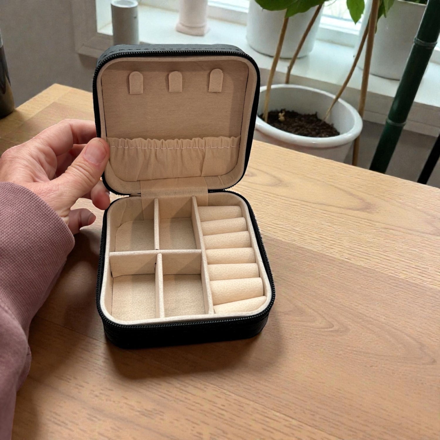 Travel-size jewelry box that’s small, compact, and protective. Perfect for keeping your favorite pieces safe and tangle-free on the go.