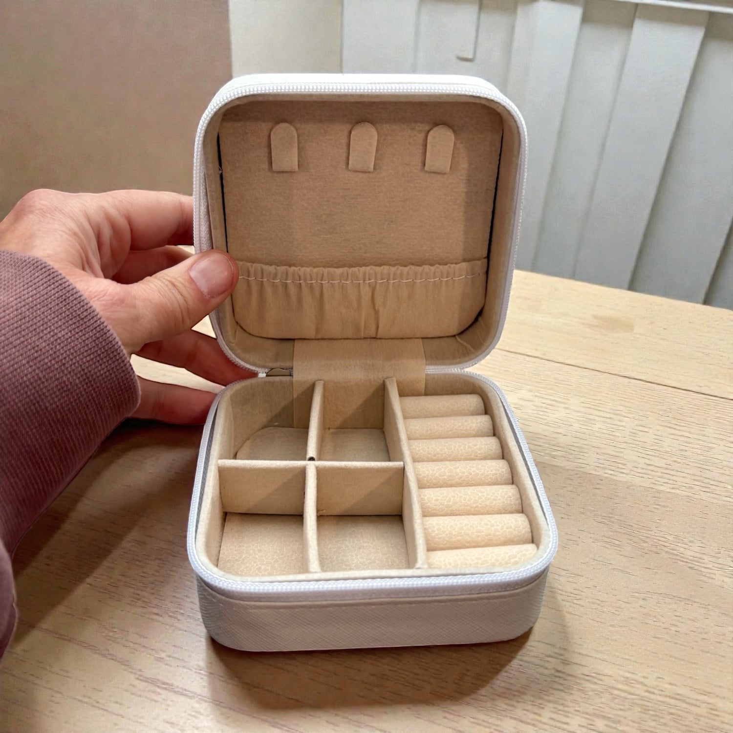 Travel-size jewelry box that’s small, compact, and protective. Perfect for keeping your favorite pieces safe and tangle-free on the go.