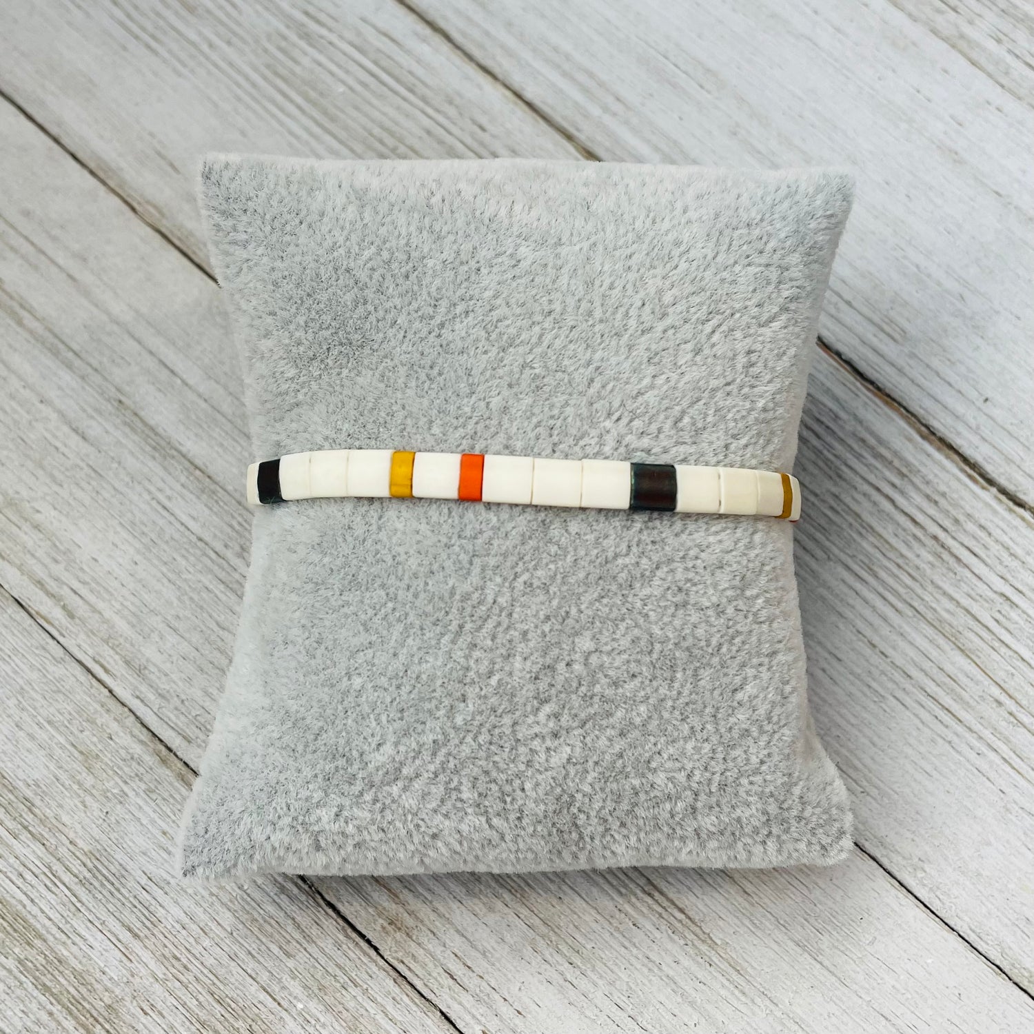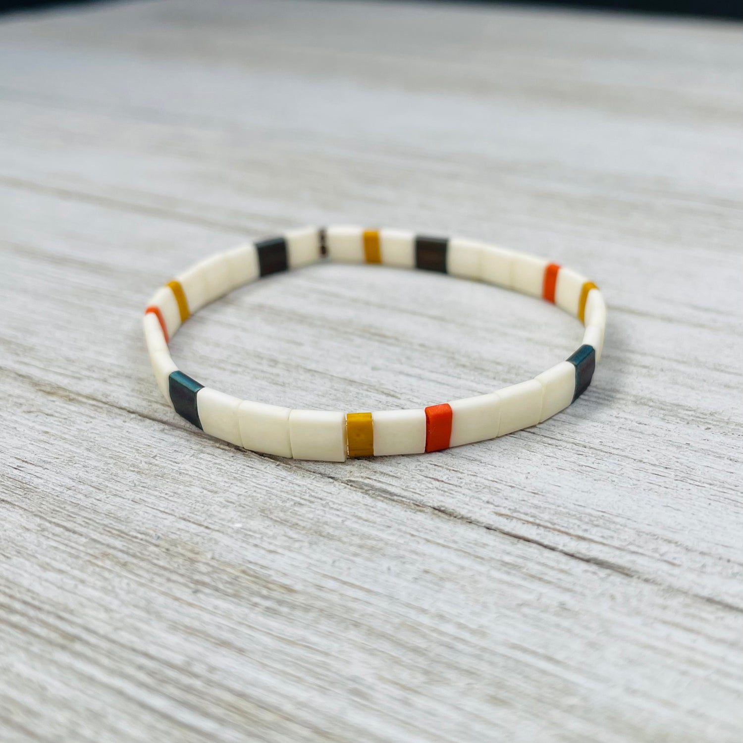 These beautiful, stretchy bracelets are handmade with Miyuki Tila Beads. Tila beads are square, flat beads that will lay flat on your wrist so you don't need to worry about them being too bulky.